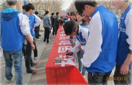 10日下午4点左右,志愿者们统一着装,积极宣传、广泛号召,吸引了一批又一批靓丽学子前来参与,大家纷纷在“校园和谐学雷锋,弘扬青春正能量”的横幅上签下自己的姓名和誓言,以表达对雷锋精神的崇敬与追随。明媚的阳光下,映照出同学们一张张笑脸,那是从内心发出的幸福与坚定的微笑,相信每一位签下姓名的同学,每一名在场的志愿者,定能在三月,在2014年,在未来,一直为“正能量”奉献!学雷锋,从三月,从这里开始。每一个人,定能签到做到!