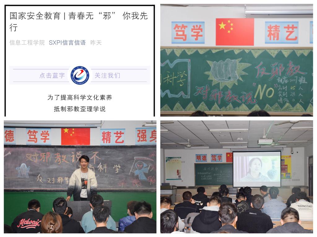 ——紧扣主题,开展专题宣传。信息学院官微“SXPI信言信语”推出《青春无“邪” 你我先行》专题学习,通过理论学习、案例分析、法规宣传等多模块开展,增强大家自觉维护国家安全的责任感和使命感,切实提升学生国家安全认知水平。