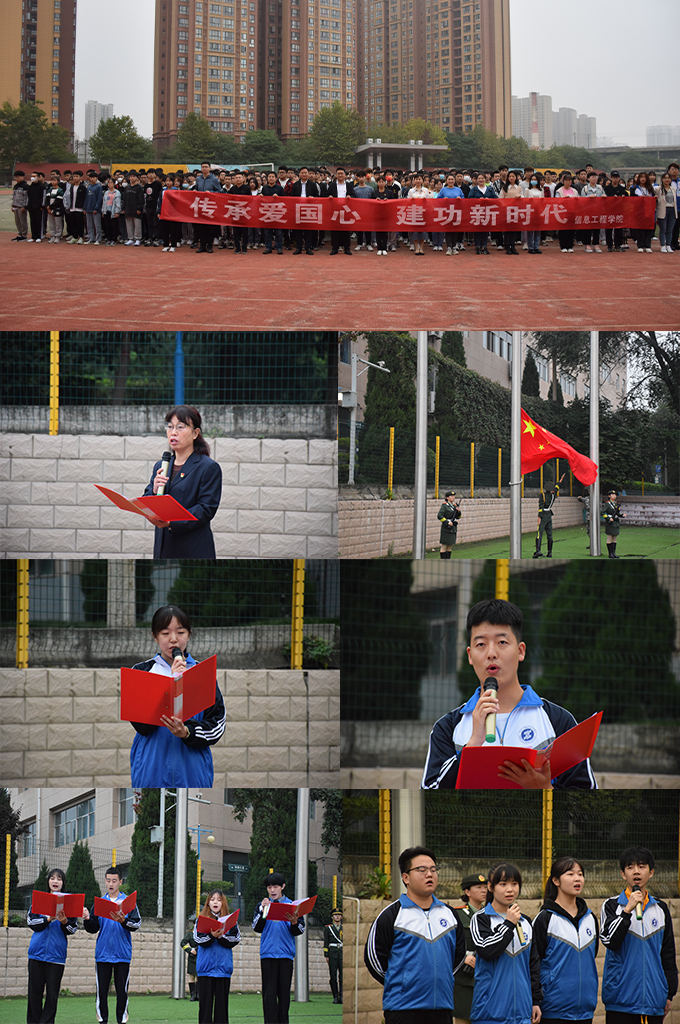 信息学院党总支副书记郭新玲作了题为《传承爱国心建功新时代》的讲话。她指出,国家正处于伟大复兴的关键时期,学校正处于“双高”建设和职教本科的关键时期,我们要做有责任担当、有家国情怀的新时代建设者和驱动者,在全面建成社会主义现代化强国的征程中建功立业。希望同学们立鸿鹄之志,坚定理想信念;修高尚之德,提升自身素养;兴学习之风,提高本领才干。学生代表数媒2112班雒欣怡、智控2001班刘玉川分别做了题为《传承爱国志,坚守奋斗情》的主题演讲和《推心置腹》党史故事讲授,号召同学们用实际行动报效祖国,实现自己的青春价值。软件2103班王宇鹏等四名同学以朗诵诗歌《我爱你祖国》的方式,致敬新中国成立72周年,他们嗓音嘹亮、声情并茂,诵出了属于青年的时代最强音,展现了浓浓的爱国情。