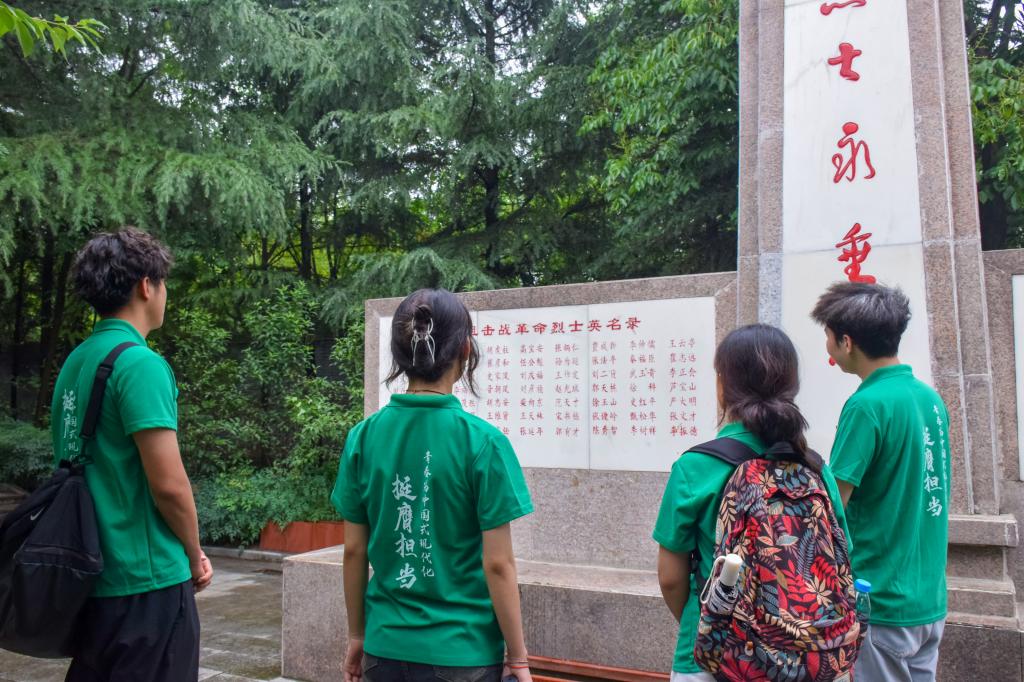 活动伊始,实践团全体成员静默肃立,高举右手,面对党旗重温入党誓词,立下铮铮誓言。同学们怀着崇敬的心情鞠躬致敬,逐一向革命烈士纪念碑敬献鲜花,表达对革命烈士的缅怀和敬意。随后,同学们还参观了革命烈士纪念碑,学习革命英雄事迹,感受革命先烈英勇顽强的战斗作风、坚贞不屈的英雄气节、坚韧不拔的革命意志、敢于牺牲的献身精神。在革命烈士纪念碑前,实践团成员王钊溥向同学们分享了咸阳抗日英雄杨嘉瑞,在著名的黄土岭战斗中,把日军名将阿部规秀及其所部诱进我军包围圈并全部歼灭的事迹。
