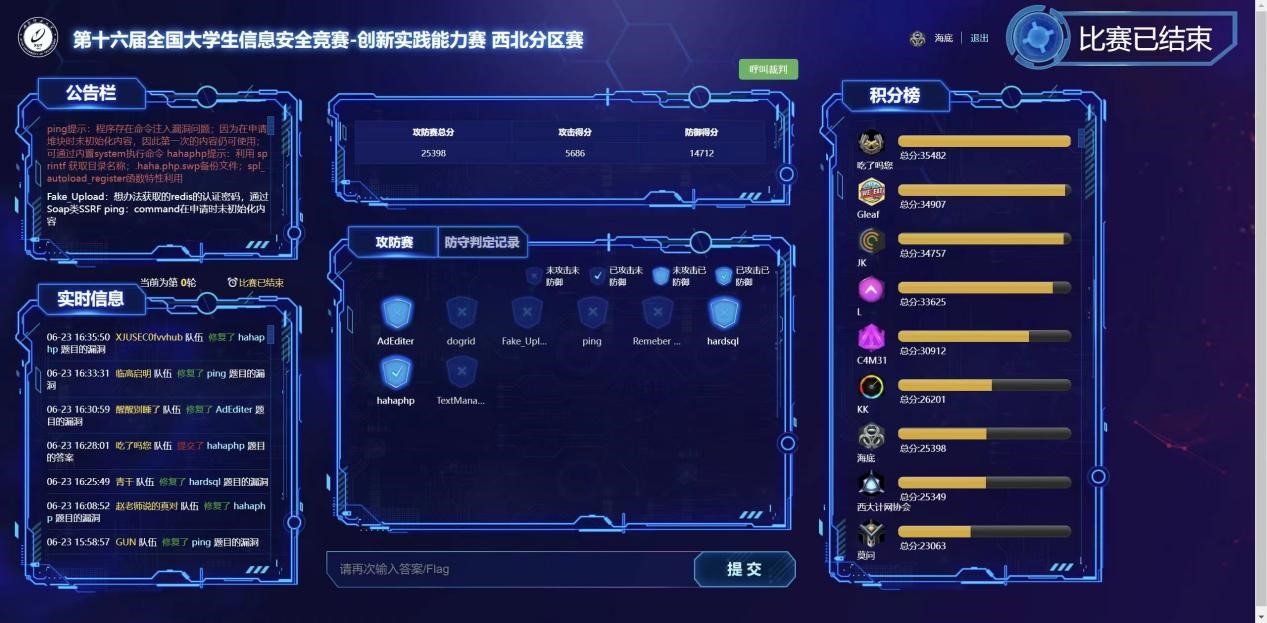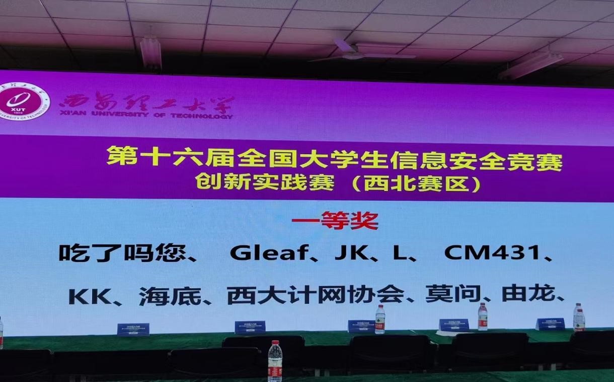 6月23日,2023年第十六届全国大学生信息安全竞赛创新实践能力赛西北赛区分区赛在西安理工大学举行,来自西安电子科技大学、西安邮电大学、西北工业大学、西安理工大学等30所高校,53支战队一较高下,由我院开元网站登录入口杨鹏老师指导-安全与测试工作室的成员:网络2003班豆凯歌、网络2102班刘德辉、网络5191班魏子恒、网络2102班董丹丹组成的海底战队,经过5月27日-5月28日线上初赛和和6月23日线下区域决赛,激烈角逐,斩获分区赛一等奖,成功晋级决赛。