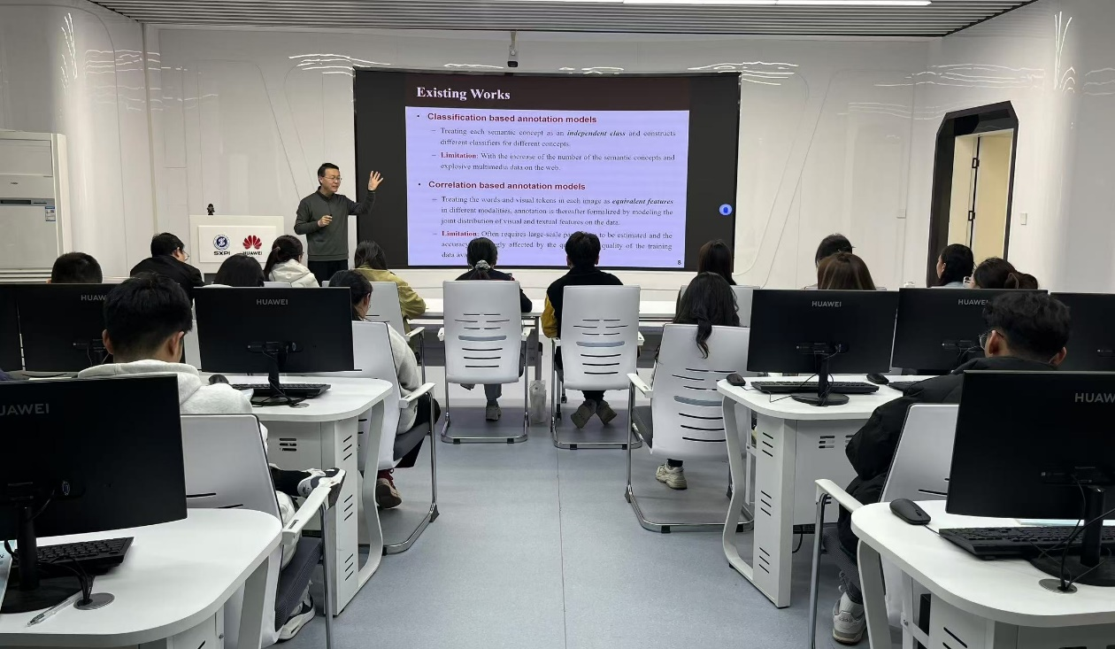 会上,田东平教授围绕计算机视觉方向最新的研究课题及成果进行深入讲解。首先,田教授介绍了图像标注技术的背景和重要性。接着,分享了考虑跨模态相关性的基于GMM的自动图像标注方法的创新,强调了跨模态相关性在自动图像标注中的重要性。最后,展示了该方法的实验结果,并与传统的图像标注方法进行了对比。报告过程中,田教授深入浅出、旁征博引,全面展示了计算机视觉领域的最新研究成果,传授了科研方法和心得,参会师生认真聆听,并积极进行互动交流。